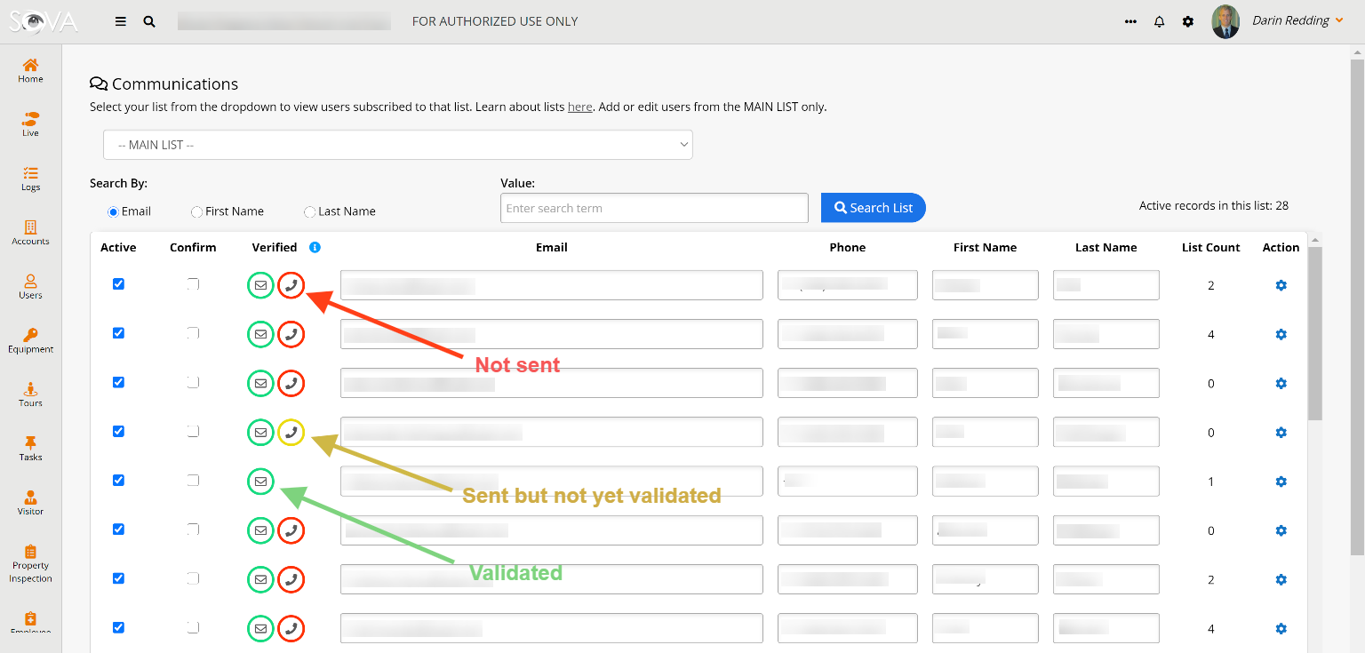 NOTE: In the screen image above, you will notice that the "verified" icons for email (envelope icon) or SMS (phone icon) are either green, yellow or red. Yellow indicates that SOVA has sent the recipient an email or SMS, asking then to reply to confirm their email address or mobile number. The yellow indicates that the recipient has not yet confirmed their message. You can always resend the original email or SMS by double clicking these yellow icons. Red indicates that the recipient has not been sent the confirmation email or SMS, and green indicates recipients that have confirmed their communication methods.