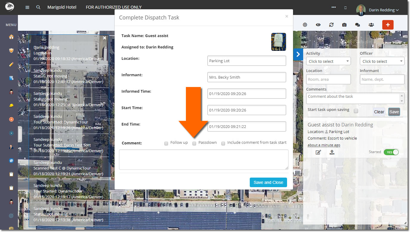 In the screenshot below, we are showing the live dispatch screen. In front of the dispatch map and to the right of the floating activity feed panel you will see a popup where we can add final details about the NTT and mark the task as being completed. In the popup in the center of the image below you will see a checkbox named "Passdown" which is indicated by the arrow. This optional checkbox can be checked to send the task to the passdown report.